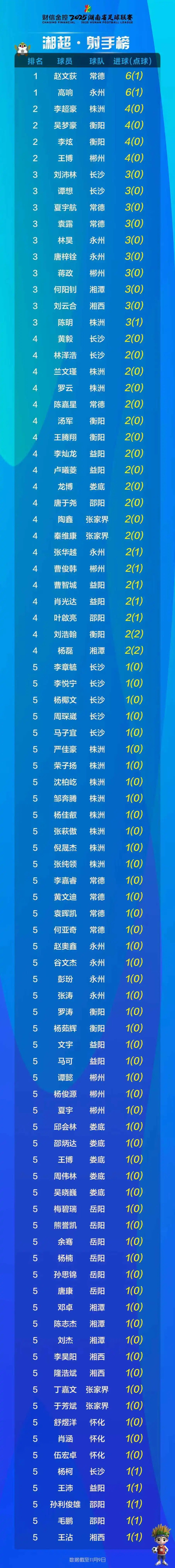 射手榜上,常德隊(duì)趙文荻和永州隊(duì)高響目前同以6個(gè)進(jìn)球位居榜首。