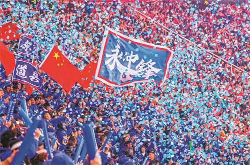12月20日晚,湘超永州隊(duì)球迷在長沙賀龍體育場“藍(lán)色海洋”中為永州隊(duì)進(jìn)球而歡呼慶祝。 永州日報全媒體記者 文佳星 攝