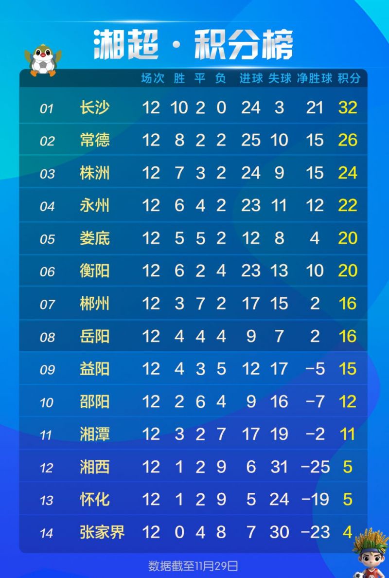湘超第12輪積分榜、射手榜(截至11月29日)