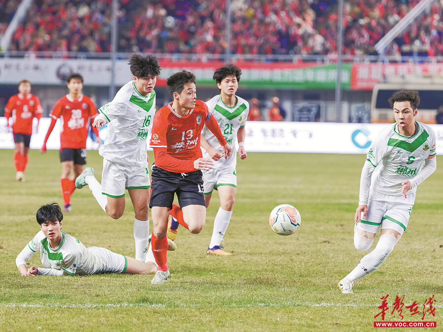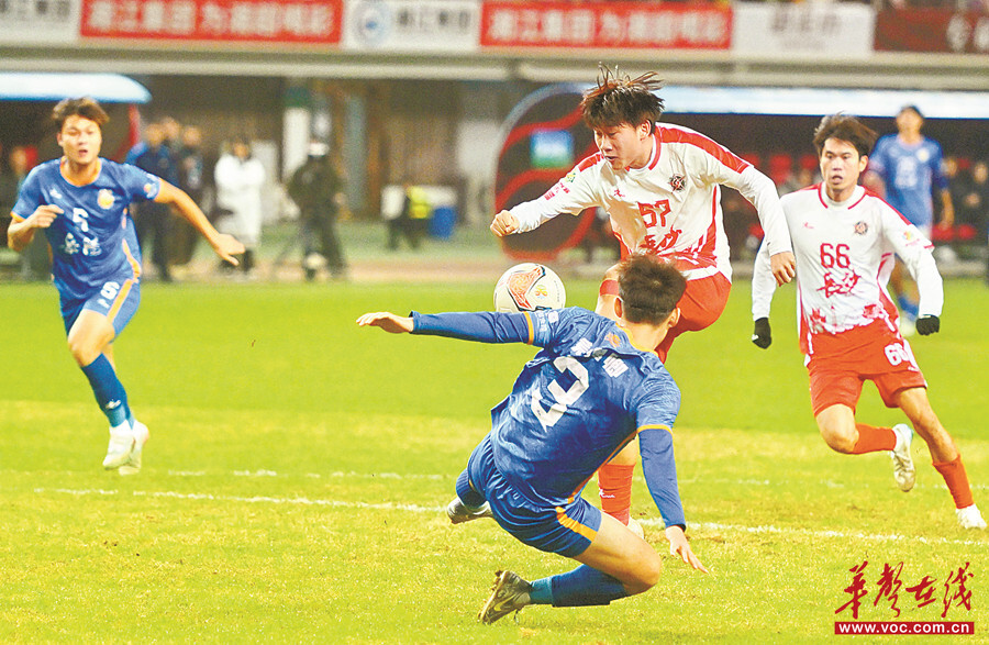 ?12月14日晚,長沙賀龍體育場,球員在比賽中激烈拼搶。當天,2025湘超聯賽淘汰賽首輪戰(zhàn)火燃爆!長沙隊(紅)主場迎戰(zhàn)岳陽隊,最終以2比0戰(zhàn)勝岳陽隊,與常德、永州、株洲三支球隊攜手挺進四強。本組照片為華聲在線全媒體記者郭立亮及通訊員攝