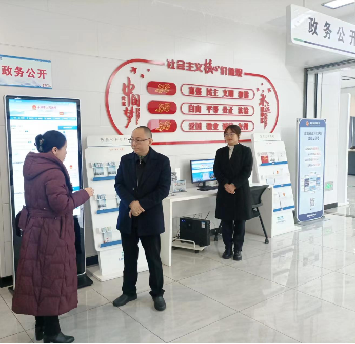 李欽一行先后現(xiàn)場(chǎng)考察了市政務(wù)服務(wù)中心辦事大廳的“湘易辦”線下體驗(yàn)中心,稅務(wù)、市場(chǎng)監(jiān)管、人社、政務(wù)公開專區(qū)、住房公積金、工程建設(shè)領(lǐng)域?qū)徟却翱冢?以及12345熱線接線大廳。與工作人員親切交談,詳細(xì)了解大廳基本情況、辦事流程、便民措施和政務(wù)公開等相關(guān)情況。