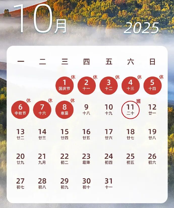 10月1日(周三)至10月8日(周三)放假調休,共8天。9月28(周日)、10月11日(周六)需補班。