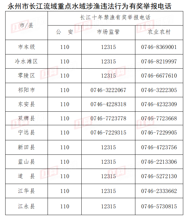 紅網(wǎng)時刻新聞1月21日訊 根據(jù)2023年5月31日省農(nóng)業(yè)農(nóng)村廳、省公安廳等四部門聯(lián)合印發(fā)的《關(guān)于實施湖南省長江流域重點水域“十年禁漁”違法行為有獎舉報制度的通告》(以下簡稱《通告》),凡發(fā)現(xiàn)在永州禁捕水域、禁漁期進行非法捕撈等違法行為或線索的,可向農(nóng)業(yè)農(nóng)村、公安、市場監(jiān)管等職能部門的執(zhí)法機關(guān)進行舉報,舉報者最高可獲20000元獎勵。永州各縣市區(qū)舉報電話附后。