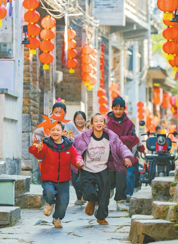 提著燈籠的孩童穿梭在古巷里,暖黃的燈影落在斑駁的青石板路上,古村的年味,在巷陌間生生不息。