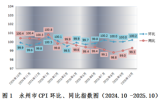 2025年10月份,食品供應(yīng)總體充足,永州居民消費(fèi)價(jià)格(CPI)同比價(jià)格下跌0.7%,環(huán)比價(jià)格上漲0.2%。