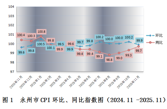 2025年11月份,食品供應(yīng)總體充足,永州居民消費價格(CPI)同比價格下跌0.3%,環(huán)比價格下跌0.1%。