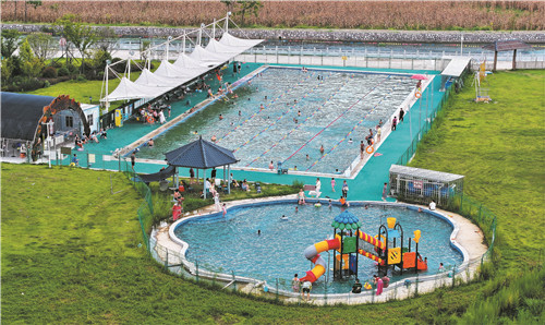 8月3日,新田縣東升農(nóng)場(chǎng)勞動(dòng)教育實(shí)踐研學(xué)基地水上樂(lè)園,市民帶著孩子在游泳池中游泳。近年來(lái),新田縣東升農(nóng)場(chǎng)勞動(dòng)教育實(shí)踐研學(xué)基地將東升村荒廢的河灘改造成一個(gè)現(xiàn)代化游泳池,并聘請(qǐng)教練教孩子們學(xué)習(xí)游泳技能,讓孩子有了游樂(lè)戲水的場(chǎng)所,確保不發(fā)生溺水意外事故?!①F雄 攝
