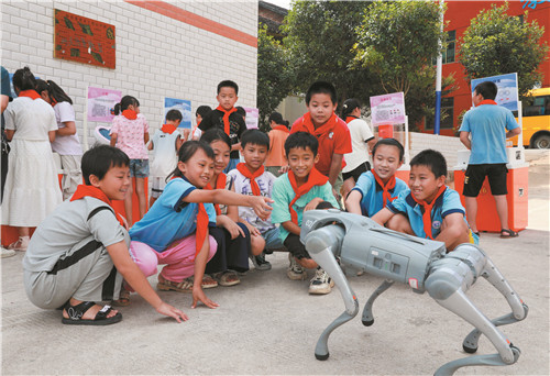 9月10日,新田縣三井學校,學生在與機器狗互動。當天,縣科協(xié)邀請市科普大篷車到該縣開展“科普進校園”活動,通過組織學生參觀科普展板、體驗科普儀器等活動,讓孩子們近距離感受科技的魅力,激發(fā)他們創(chuàng)新創(chuàng)造意識和科學探索精神。 劉貴雄 攝