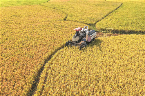 10月12日,藍(lán)山縣土市鎮(zhèn)團(tuán)結(jié)村村民駕駛收割機(jī)在田間收割水稻。金秋時(shí)節(jié),該縣種植的晚稻迎來(lái)豐收,村民搶抓晴好天氣收割水稻,確保顆粒歸倉(cāng)?!∨砣A 攝