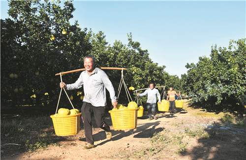 11月17日,在江永縣瀟浦鎮(zhèn)回崗村,村民們忙著采摘、挑運(yùn)成熟的香柚。近年來(lái),江永縣聚焦香柚產(chǎn)業(yè)提質(zhì)增效,大力推廣柚果套袋、營(yíng)養(yǎng)診斷施肥、聯(lián)防聯(lián)治黑蚱蟬等關(guān)鍵技術(shù),全方位提升香柚品質(zhì)?!√锶缛?攝