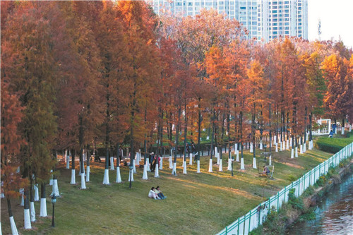 12月10日,冷水灘區(qū)仁灣街道湘江河畔的杉林換上深淺不一的紅妝,吸引市民和游客前來(lái)觀賞游玩。近年來(lái),冷水灘區(qū)堅(jiān)持生態(tài)優(yōu)先、綠色發(fā)展理念,科學(xué)規(guī)劃樹(shù)種搭配,在公園、道路綠化帶、口袋公園等地打造“四季有景、季季不同”的多彩景觀,讓市民盡享優(yōu)美的生活環(huán)境?!±字邢?蔣凌志 攝