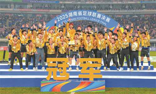 奪冠后的永州隊球員與教練在頒獎臺上高舉獎杯,慶祝這來之不易的勝利時刻。 永州日報全媒體記者 文佳星 攝