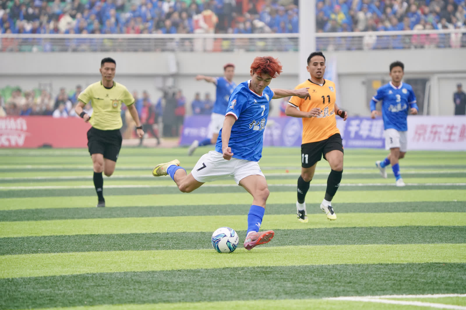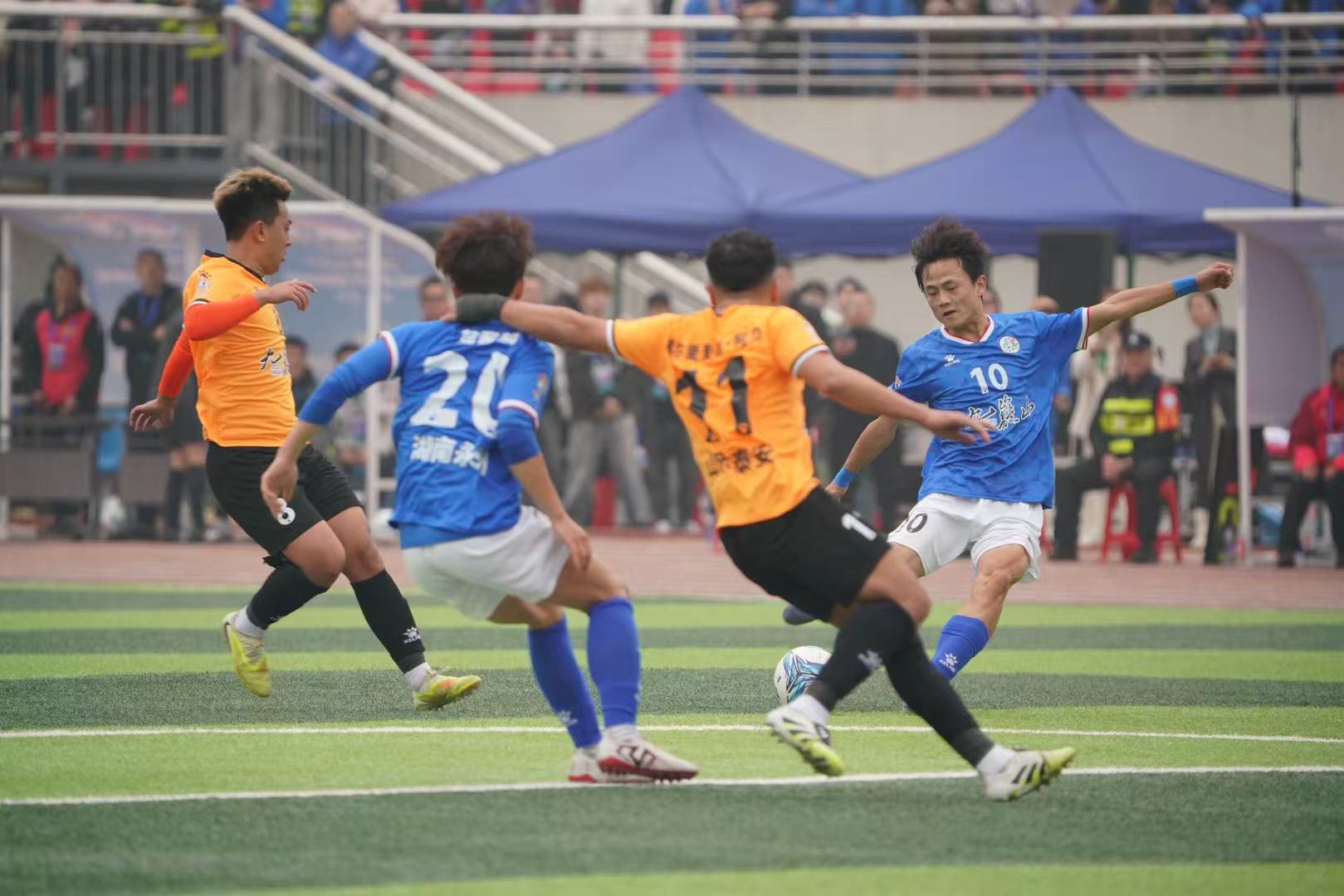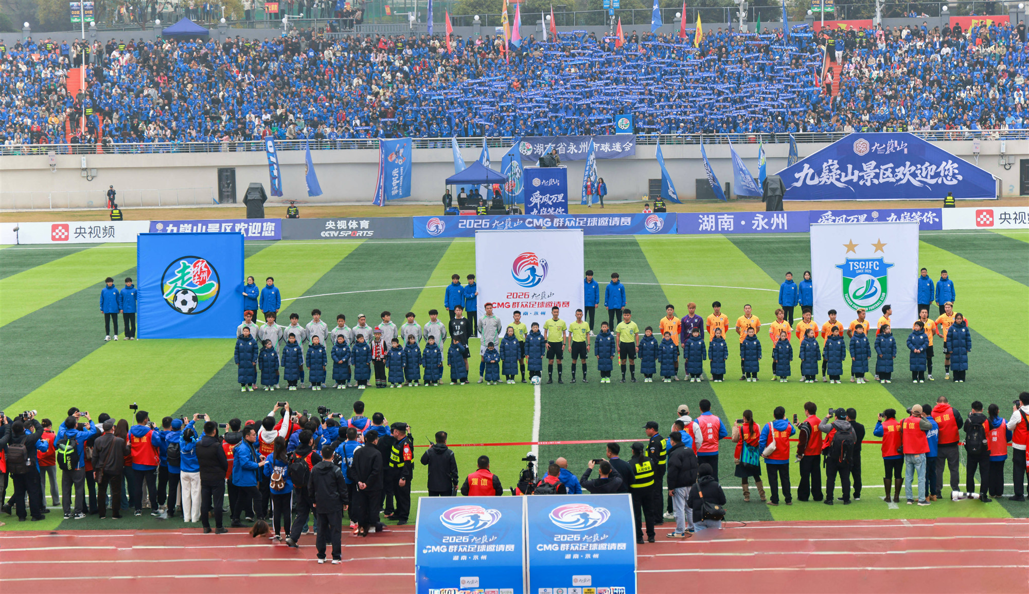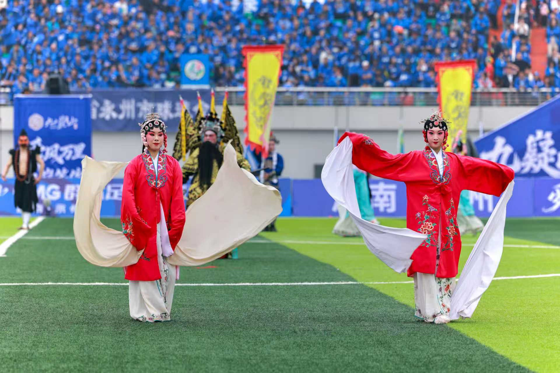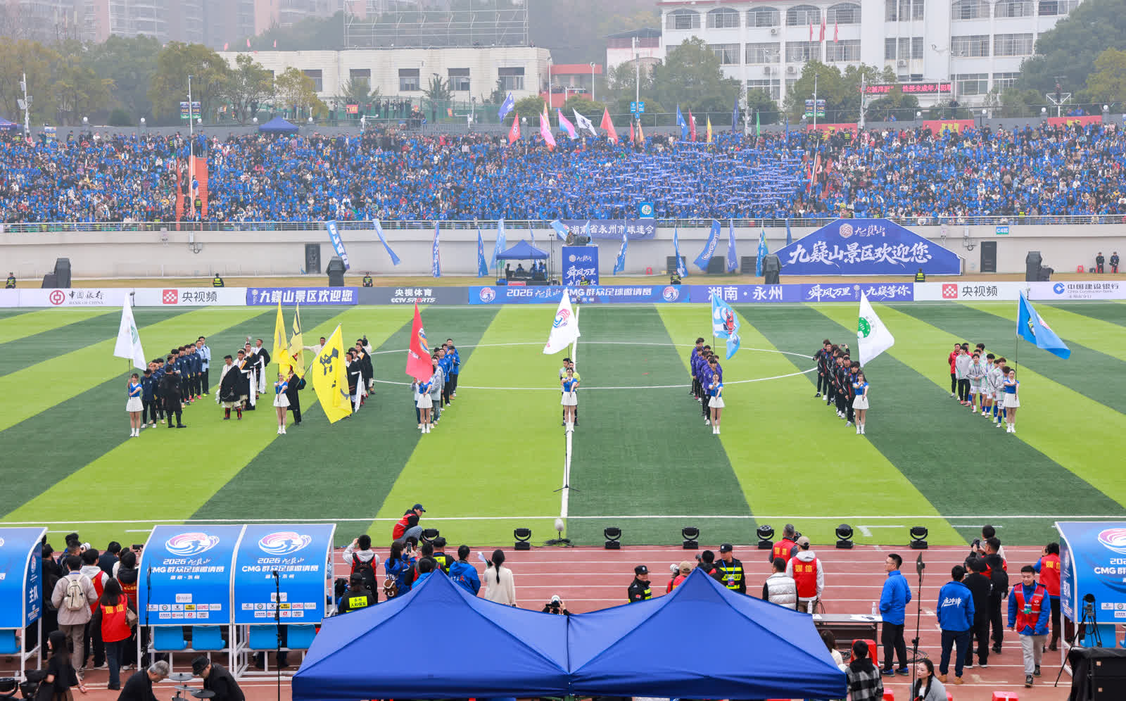 開(kāi)幕式在融合音、舞、體元素的非遺秀等文藝表演中拉開(kāi)序幕。隨后,內(nèi)蒙古呼和浩特隊(duì)、山東泰安隊(duì)、黑龍江哈爾濱隊(duì)、廣東湛江隊(duì)、青海玉樹(shù)隊(duì)以及東道主“湘超”冠軍湖南永州隊(duì)六支參賽隊(duì)伍揮舞各自的戰(zhàn)旗一一亮相,齊聚綠茵場(chǎng)。