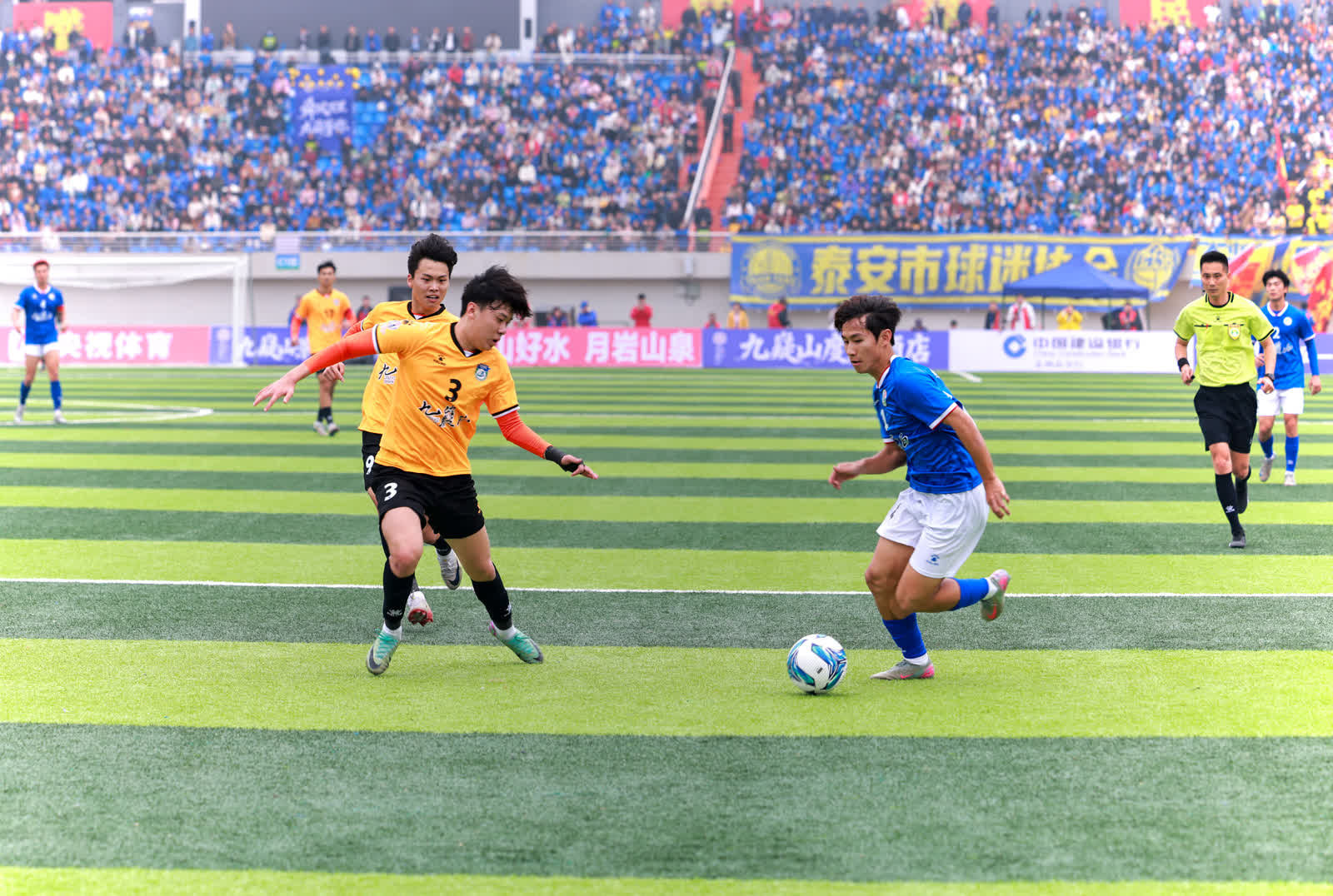下午2時(shí),揭幕戰(zhàn)在湖南永州隊(duì)與山東泰安隊(duì)之間打響,永州體育場(chǎng)山呼海嘯,人氣爆棚,共吸引15785名球迷到場(chǎng)助威。比賽開(kāi)場(chǎng)僅3分鐘,山東泰安隊(duì)28號(hào)前鋒白云飛接45度傳中頭球破門(mén),取得領(lǐng)先。永州隊(duì)迅速做出回應(yīng),第7分鐘,7號(hào)林昊利用一次反擊,在大禁區(qū)外踢出一記“世界波”,足球擊中門(mén)框下沿破門(mén),將比分扳為1:1。上半場(chǎng)雙方在中場(chǎng)開(kāi)展激烈爭(zhēng)奪,均未再改寫(xiě)比分。