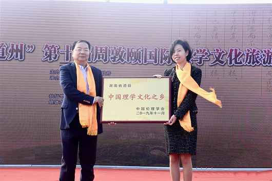 (2019年12月16日,“理學(xué)道州”第十屆周敦頤國(guó)際理學(xué)文化旅游節(jié)在濂溪故里舉行開(kāi)幕式。圖為中國(guó)倫理學(xué)會(huì)向“中國(guó)理學(xué)文化之鄉(xiāng)”道縣授牌現(xiàn)場(chǎng)照。)