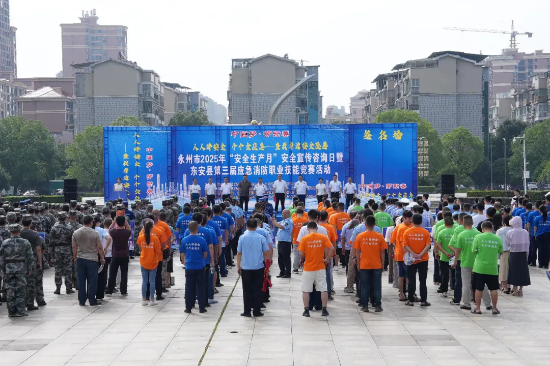 今年6月是全國第24個“安全生產(chǎn)月”,為積極營造“安全生產(chǎn)月”活動宣傳氛圍,提高全市應(yīng)急救援隊伍救援核心能力和廣大人民群眾的安全意識和風(fēng)險防范能力,6月16日,永州市2025年“安全生產(chǎn)月”安全宣傳咨詢?nèi)蒸邧|安縣第三屆應(yīng)急消防職業(yè)技能競賽活動在東安舉行。永州市消防支隊支隊長歐軍歌,市應(yīng)急管理局黨委委員、政治部主任張泉,東安縣委常委、常務(wù)副縣長張恒參加活動。