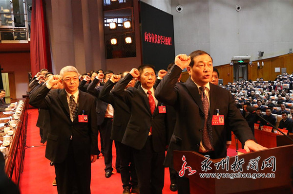 會上,永州市人大常委會秘書長蔣千紅帶領(lǐng)新當選人員向憲法莊嚴宣誓。