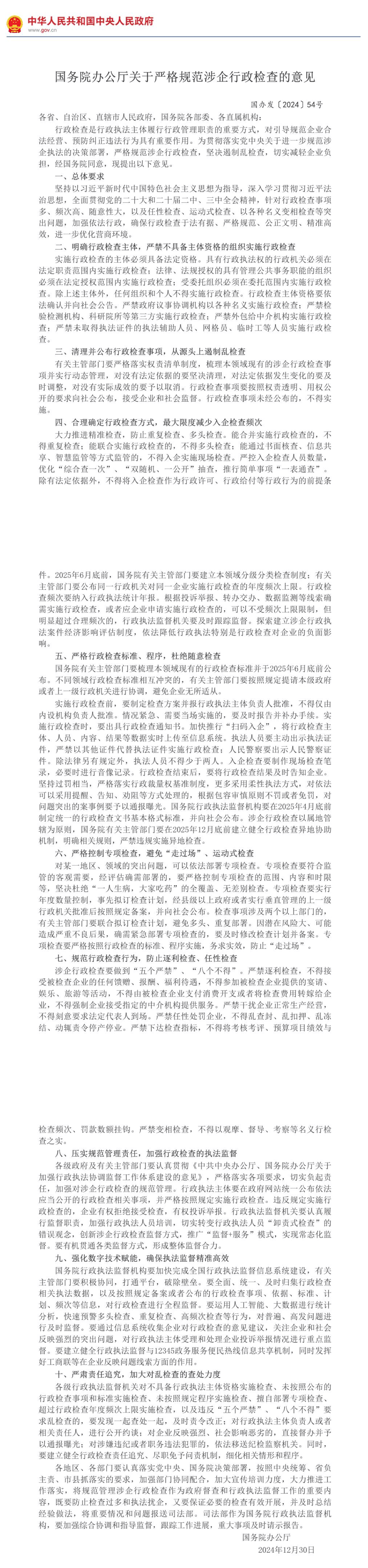 國(guó)務(wù)院辦公廳關(guān)于嚴(yán)格規(guī)范涉企行政檢查的意見(jiàn)