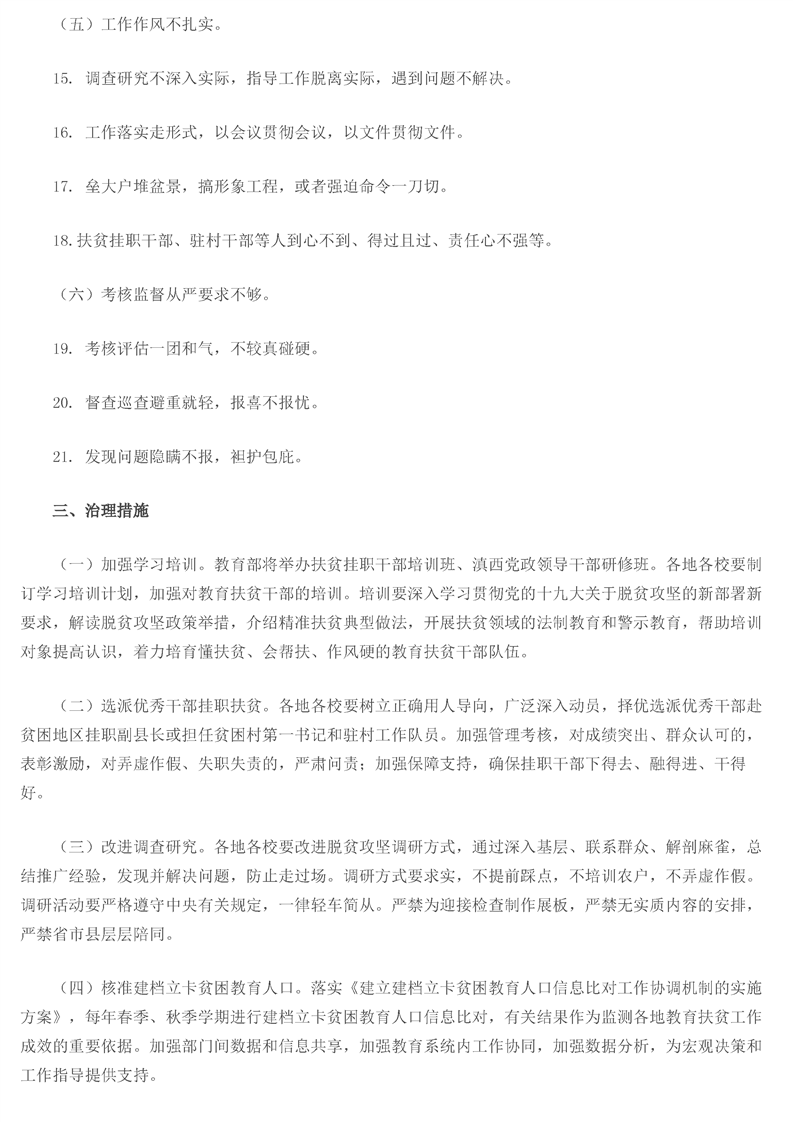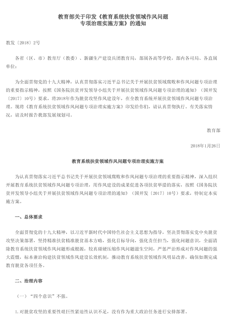 教育部關(guān)于印發(fā)《教育系統(tǒng)扶貧領(lǐng)域作風問題專項治理實施方案》的通知