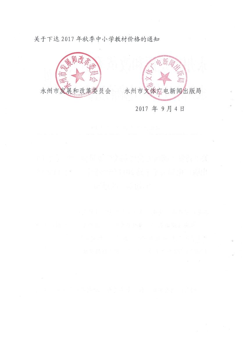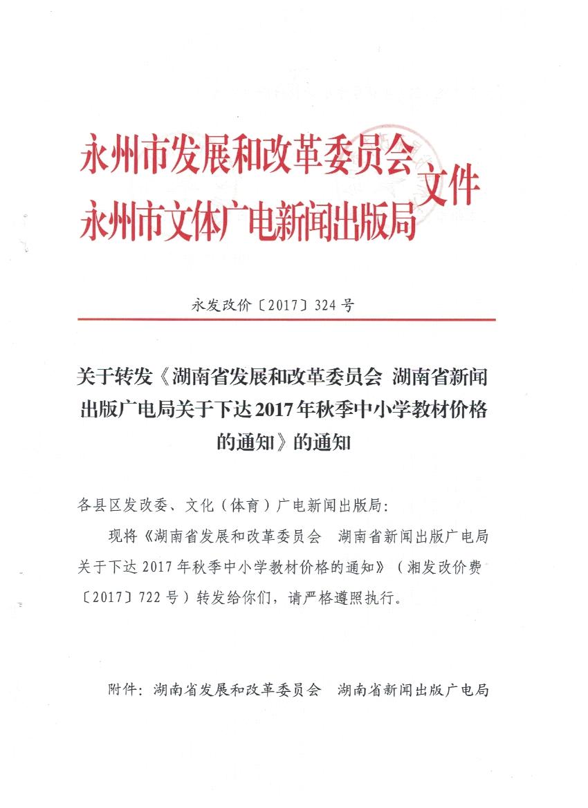 關(guān)于轉(zhuǎn)發(fā)《湖南省發(fā)展和改革委員會 湖南省新聞出版廣電局關(guān)于下達2017年秋季中小學教材價格的通知》的通知