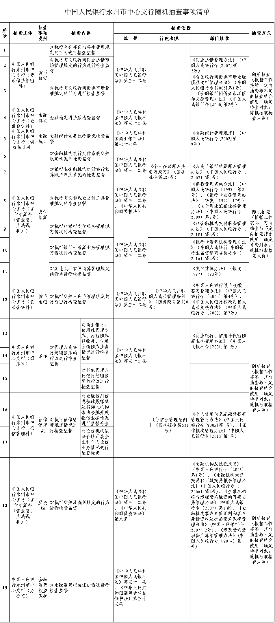 中國(guó)人民銀行永州市中心支行隨機(jī)抽查事項(xiàng)清單
