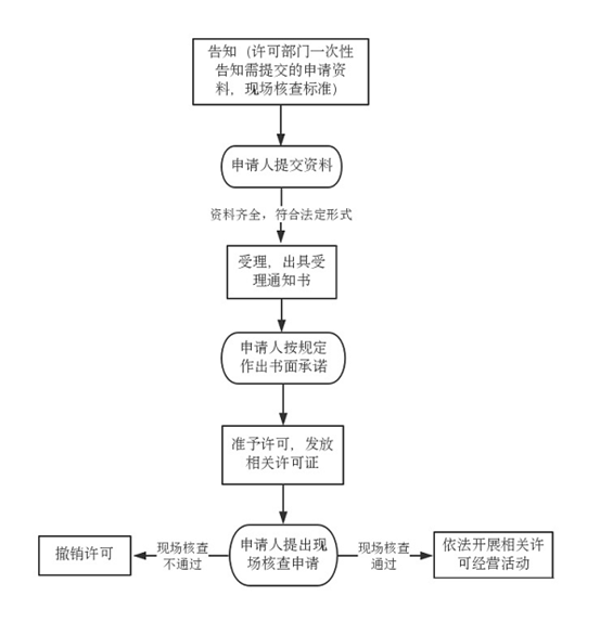 許可部門一次性告知申請人需提交的申請資料規(guī)范和現(xiàn)場核查標準;申請人根據(jù)告知內(nèi)容提交的申請材料齊全、符合法定形式,并對材料的真實性負責,許可部門即予以受理,出具受理通知書;許可部門受理后,在申請人按規(guī)定作出書面承諾的基礎上,即可頒發(fā)相關許可證(附件2)。